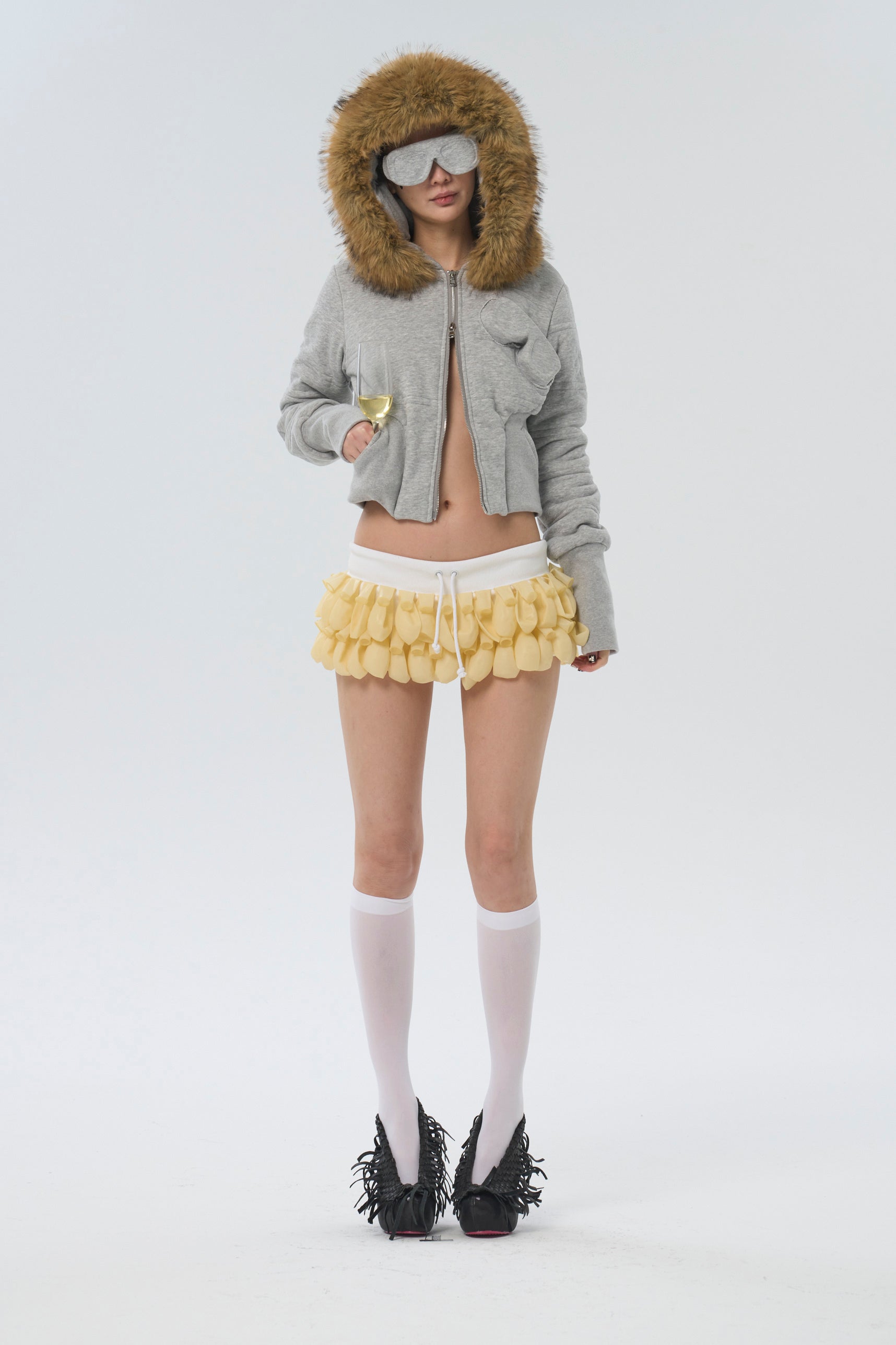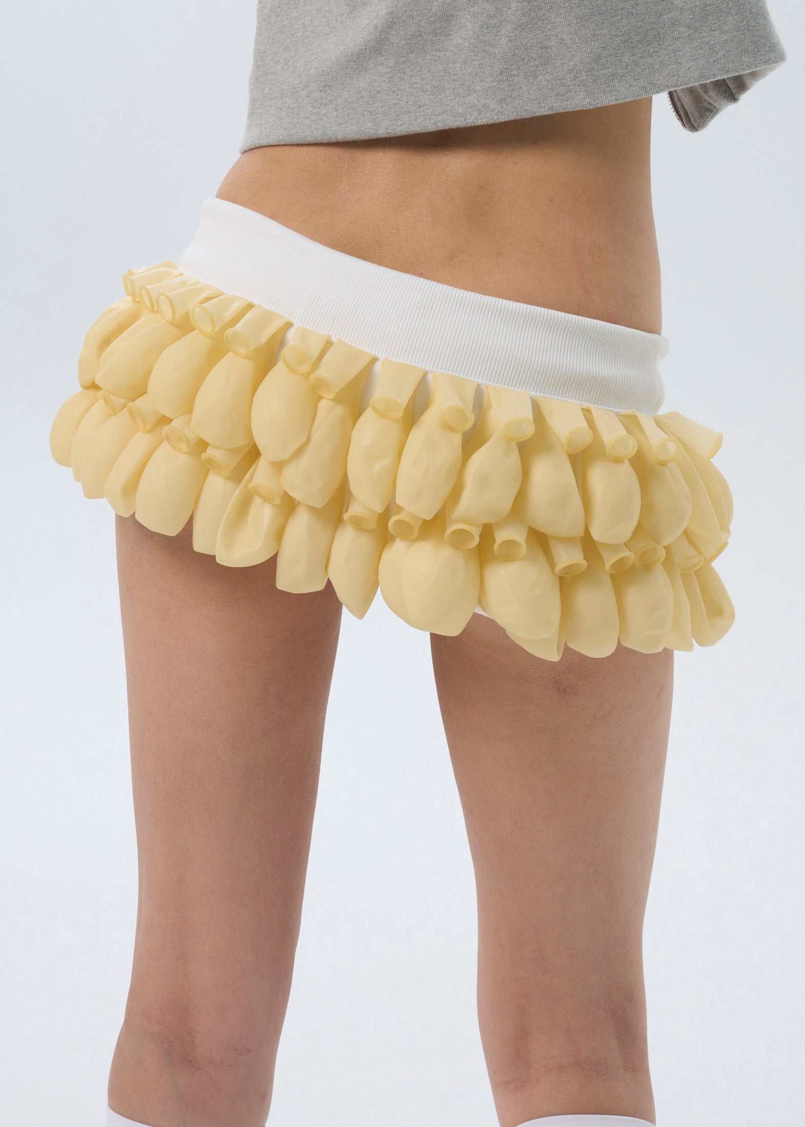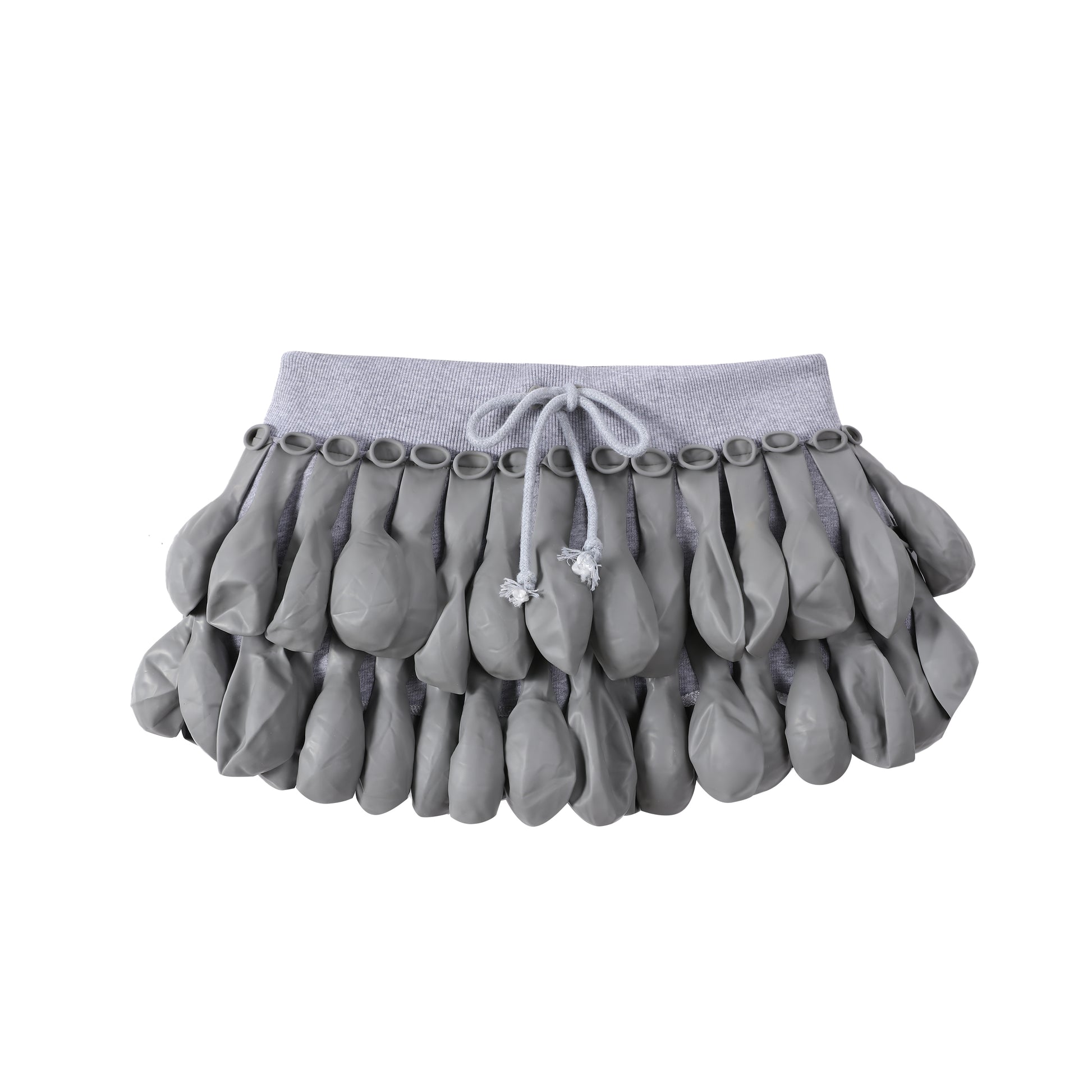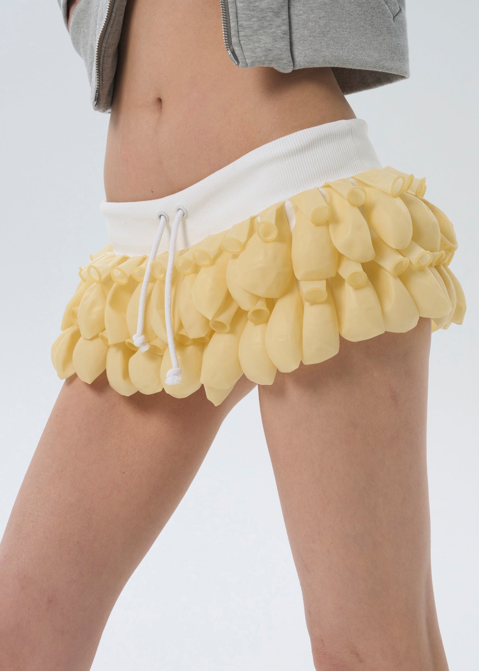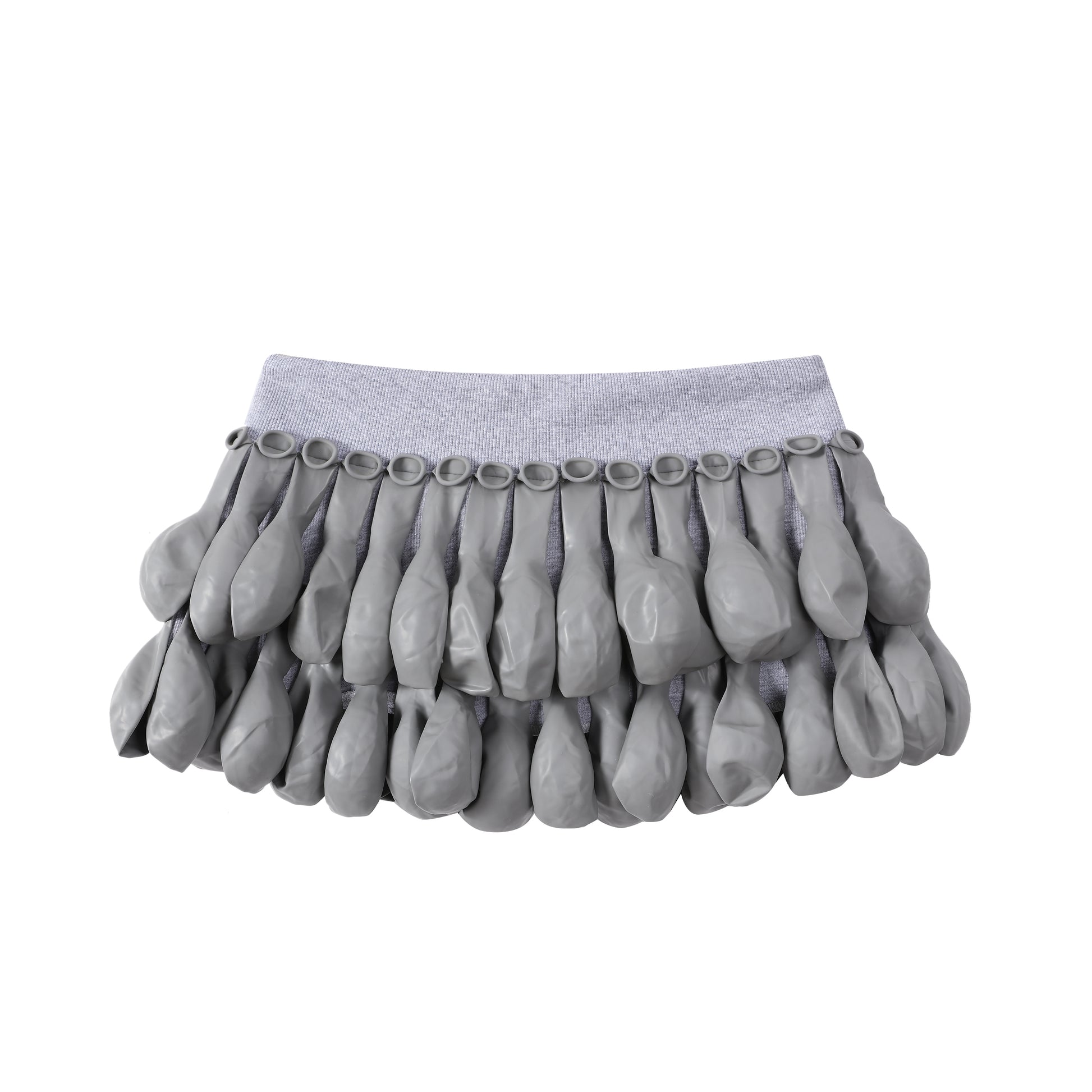 A low-rise ultra-mini skirt with a tiered “cake” silhouette, crafted from stretch latex-inspired fabric for a playful and body-contouring fit.