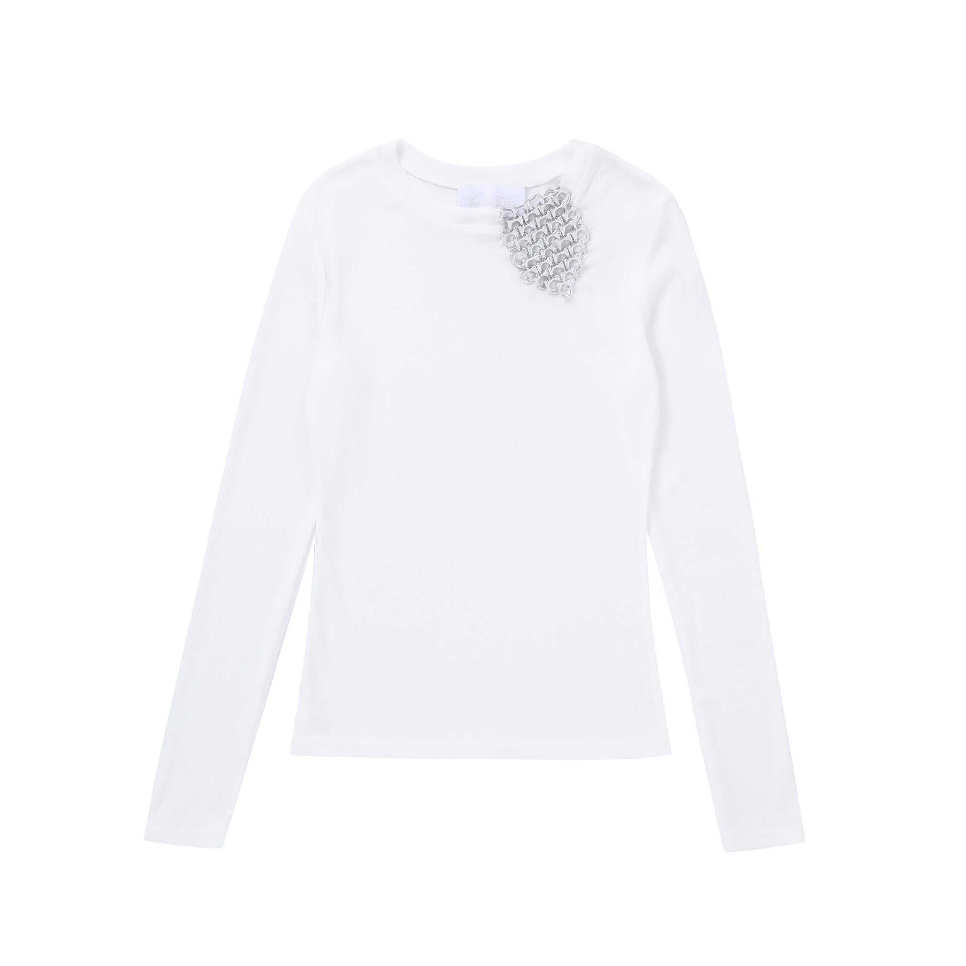 A lightweight long sleeve tee defined by hand-assembled pull-tab chainmail patchwork and openwork construction.