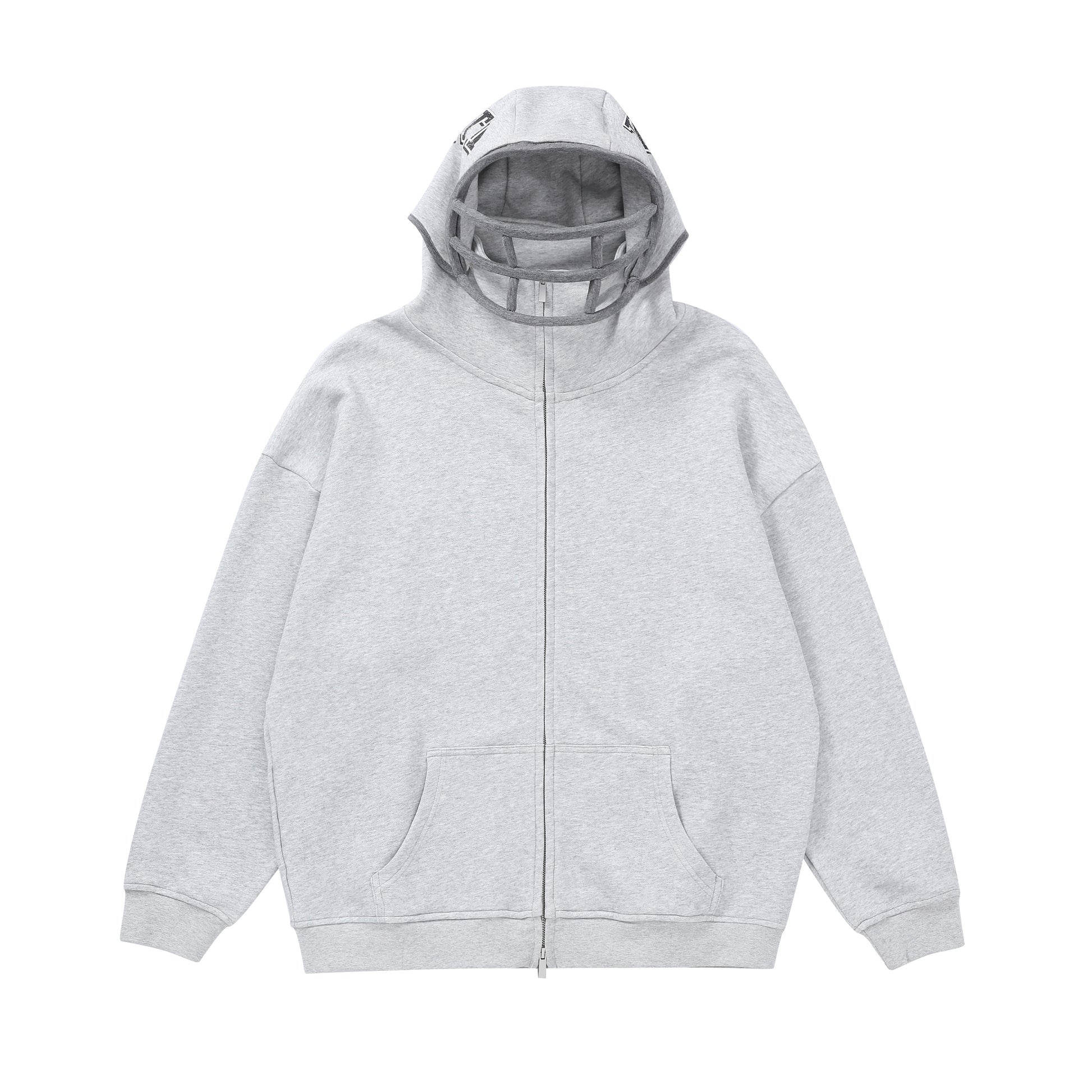 A light grey unisex zip-up sweatshirt with a relaxed, draped silhouette and a hood shaped after a football cap, reinterpreted in fabric.
