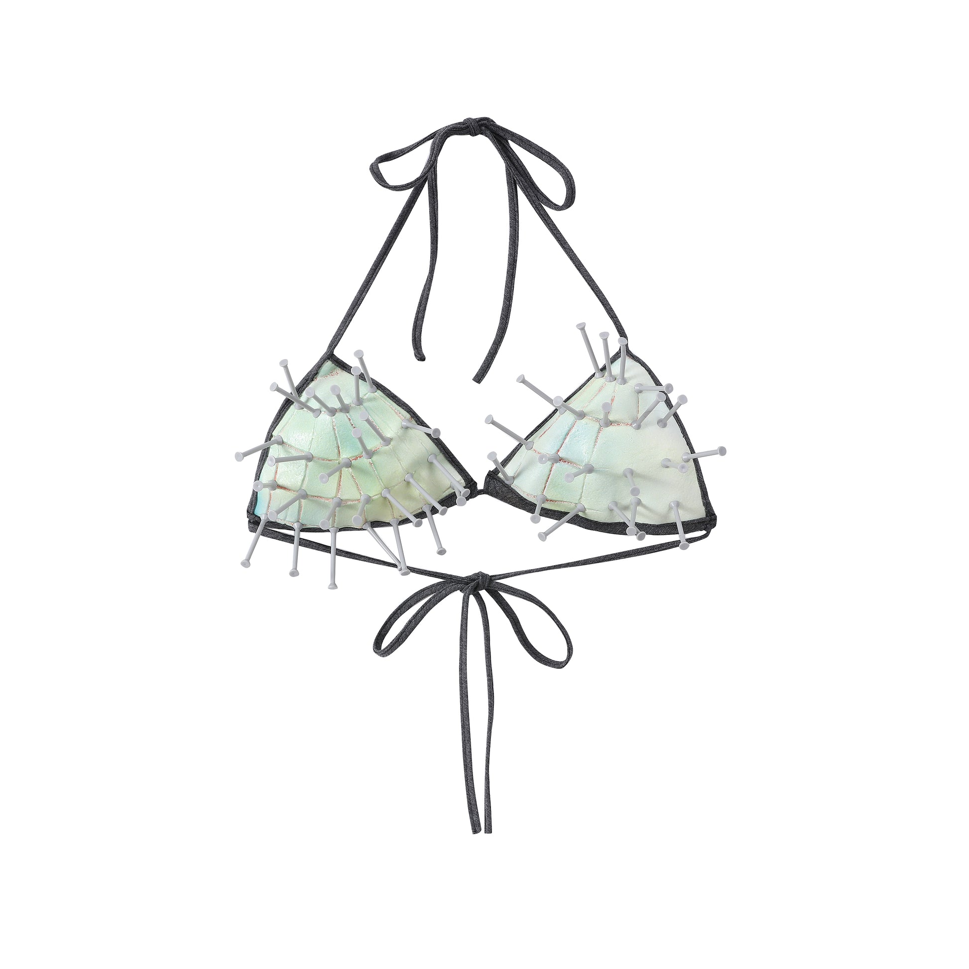 A sculptural rubber bikini with hand-applied metal studs, designed to be worn as bold outerwear.