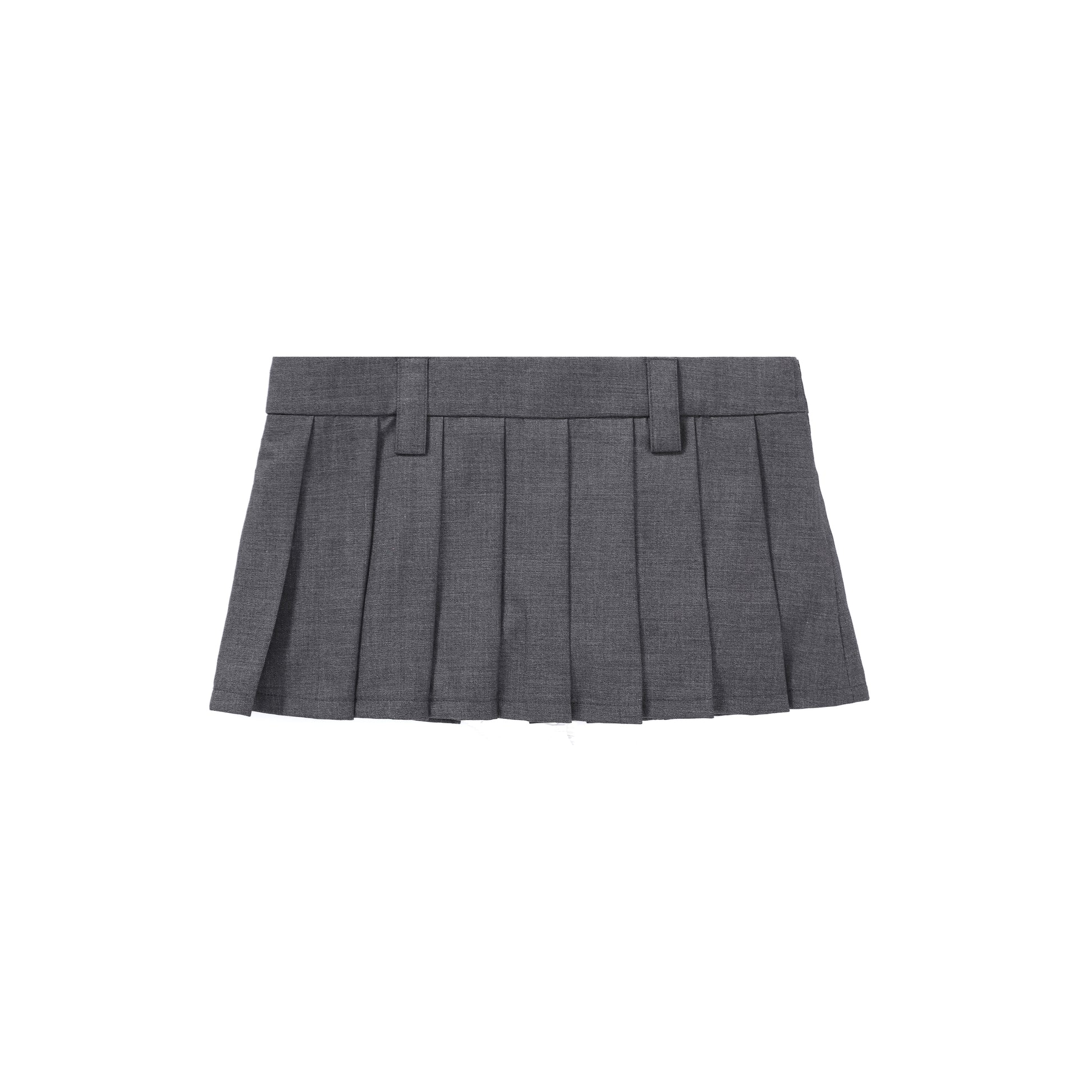 A wool-blend ultra-mini A-line pleated skirt with a mid-to-low rise, featuring a double-layer construction, deconstructed faux placket, and turned-back detailing.